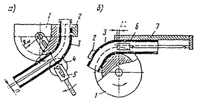 полиэтиленовых труб: 4.2.17. Формование горловин. Горловины в пластмассовых трубах применяют при изготовлении переходных тройников и коллекторов с переходными ответвлениями в трубопроводах из ПЭВД ПЭНД и ПП. Различают два способа формования горловин в трубах с помощью пуансона без изменения толщины стенки трубы (рис.4.19а); с помощью пуансона и матрицы с принудительным изменением толщины стенки формуемой горловины (рис. 4.19 б). Рис. 4.19. Схема процесса вытяжки горловины в трубах: 4.2.18. Калибровка концов труб. Калибровку концов труб из ПВХ выполняют при их подготовке к склеиванию. Для сварки в раструб труб из ПНП, ПВП и ПП калибровку концов отдельно не производят, так как этот процесс выполняется при оплавлении конца трубы в гильзе нагревательного сварочного инструмента. Калибровку выполняют в нагретом состоянии. Нагретая в глицериновой ванне или горячим воздухом до температуры 130±5°С труба вставляется в калибровочную гильзу. Для выполнения калибровки на конце пластмассовой трубы можно использовать устройство, применяемое для формования раструба (см. рис. 13.15). Охлаждение трубы осуществляется вместе с гильзой. 4.3. Гнутье труб.4.3.1. Гнутье труб диаметром 25…160 мм применяют для изготовления соединительных деталей трубопроводов из пластмассовых труб - отводов, уток, калачей, компенсаторов и др. Гнут трубы в размягченном состоянии после нагрева. Радиус изгиба по оси трубы по ПЭ, ПП и ПВХ должен быть не менее 3,5…4 DН, а для труб из фторопласта - не менее 10 DН где DH - наружный диаметр трубы. 4.3.2 При гнутье пластмассовых труб необходимо выполнить следующие операции: разметку и резку труб на заготовки, измерение толщины стенки трубы; нагрев трубы; гнутье; охлаждение детали после гнутья; торцовку концов детали. Длина трубы заготовки, мм, для гнутого отвода составляет L=φπR/180+2ℓ, где φ - угол изгиба трубы, град; R - радиус гиба по оси трубы, мм; ℓ - длина прямого участка, необходимого для зажима трубы при гнутье и последующей сварке, мм. 4.3.3. В трубах перед гнутьем измеряют толщину стенки. На утолщенной стенке делают пометку, а при гнутье трубу устанавливают так, чтобы утолщенная стенка располагалась с наружной стороны гиба. Заготовку предварительно нагревают до заданной температуры в жидкостных (глицериновых, гликолевых) ваннах, электропечах или в газовых и паровых камерах. При гнутье отводов и концевых участков труб вертикальные глицериновые жидкостные ванны более производительны, чем электропечи. Для выполнения местных гибов на длинных трубах применяют воздушную тоннельную электропечь. В местах прохода через торцевые крышки печи трубы должны быть уплотнены по наружному диаметру, а концы труб заглушены пробками. При нагреве в вертикальных жидкостных ваннах конец заготовки должен выступать над уровнем жидкости на 2DH, чтобы оставаться холодным. Если размеры нагревательного устройства не позволяют нагреть заготовку по всей длине, ее следует гнуть в несколько приемов. При этом повторный нагрев согнутого участка не допускается. 4.3.4. Температура жидкости в ванне должна составлять, °С (±5): для труб из ПЭНД - 135; ПЭВД - 105; ПП - 165; ПВХ - 130. При нагреве труб в электропечах температура воздуха должна быть на 25…30°С выше, чем температура жидкости при нагревании. Прогрев должен быть равномерным по толщине стенки и длине сгибаемого участка. Заготовка, нагретая до тр