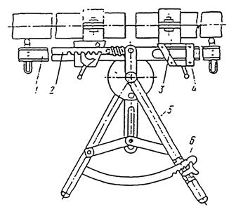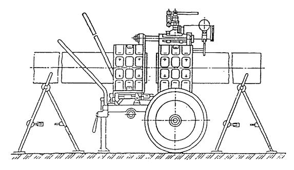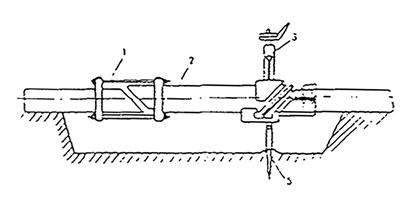 Рис. 7.4. Схема снятия фаски на конце трубы Гладкий конец трубы вводят в раструб либо раструб надвигают на трубу на всю его глубину (до тех пор, пока метка на трубе не совпадет с торцом раструба), затем трубу извлекают из раструба на 1 см. Это необходимо для компенсации температурных удлинений трубопровода. Для сборки соединений применяют различные стяжные приспособления (рис. 7.5 и 7.6). Рис. 7.5. Сборка раструбного соединения на резиновом