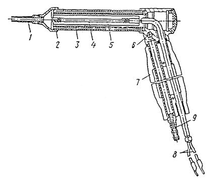 сварочных прутков в шов; 5.4.3. Для сварки пластмасс нагретым газом с применением присадочного материала отечественная промышленность выпускает электрическую горелку ГЭП-2 (рис. 5.8) Работа горелки основана на нагреве газового теплоносителя теплом электрической спирали. Горелка состоит из сопла 1, ствола 2, фарфоровой трубки 3, электрической спирали 4, изолятора 5, вентиля 6, рукоятки 7, токоподводящего провода 8, ниппеля 9 для присоединения газового шланга, в качестве которого рекомендуется применять резинотканевые рукава с внутренним диаметром 6 мм. 5.4.4. Производительность и качество сварки можно повысить за счет применения специальных наконечников. В горелке с наконечником (рис. 5.9) канал для прохода присадочного материала размещен во внутренней полости сварочного сопла наконечника. Теплоноситель, поступающий по соплу, подогревает одновременно основной материал, место сварки и присадочный пруток. Давление на пруток создается рукой, прижимающей и перемещающей горелку с наконечником вдоль шва. Пруток вводят в канал сопла после прогрева свариваемых кромок. Рис. 5.8. Горелка ГЭП-2 для сварки пластмасс Рис. 5.9. Электрическая сварочная горелка со специальным наконечником 5.4.5. В зарубежной практике монтажных работ для сварки пластмасс применяют электрические горелки, не требующие для своей работы компрессорной установки или баллона со сжатым газом. Такие горелки снабжены малогабаритным компрессором для забора и подачи воздуха в зону сварки (рис. 5.10). Рис. 5.10. Электрическая горелка с компрессором: 5.5. Прочие способы сварки.В отечественной и зарубежной практике строительства пластмассовых трубопроводов кроме рассмотренных выше в небольших объемах применяют и такие способы сварки, как сварка электросопротивлением, экструдируемой присадкой, трением, нагревом прутка в контактном нагревателе, инфракрасным излучением, растворителями. 5.6. Контроль качества сварных соединений.5.6.1. Дефекты сварных соединений пластмассовых трубопроводов подразделяются на наружные, выявляемые поверхностным осмотром, и внутренние (в сварном шве), обнаруживаемые только специальными методами контроля. Основными дефектами в сварных швах являются: несоответствие шва требуемым геометрическим размерам, подрезы, трещинообразование поры, непровары, усадочные раковины и участки материала, подверженные термоокислительной деструкции. 5.6.2. Несоответствие шва требуемым геометрическим размерам является в основном результатом нарушения сварщиком технических условий на размеры сварного шва, который должен быть в пределах допусков на его усиление. При уменьшении размеров шва снижается прочность соединения; при большом увеличении этих размеров швы нерациональны с экономической точки зрения и с точки зрения концентрации напряжений. 5.6.3. Подрезы представляют собой узкие, продольные углубления, образующиеся по краям шва в основном материале, максимальная глубина которых обычно допускается 1…2 мм. Если их глубина составляет не более 10% от толщины свариваемых элементов в неответственных конструкциях, то подрезы не подваривают. Подрезы уменьшают сечение основного материала в зоне термического влияния и служат местом концентрации напряжений и началом образования трещин. Швы с подрезами нестойки к динамическим нагрузкам. 5.6.4. Трещинообразование - наиболее опасн