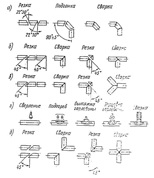 5.11. Комплект инструмента для склеивания труб из ПВХ DH=20…32 мм: 6. ИЗГОТОВЛЕНИЕ СВАРНЫХ СОЕДИНИТЕЛЬНЫХ ДЕТАЛЕЙ ТРУБОПРОВОДОВ6.1. Технология изготовления деталей и контроль их качества.6.1.1. С применением сварки изготавливаются соединительные детали трубопроводов из ПЭНД, ПЭВД и ПП. Изготовление сварных соединительных деталей пластмассовых трубопроводов осуществляется с помощью сварки нагретым инструментом встык и сварки экструдируемой присадкой. Технологические режимы приведены в разделе 5, а схема изготовления деталей дана на рис. 6.1. Рис. 6.1. Схема изготовления сварных соединительных
