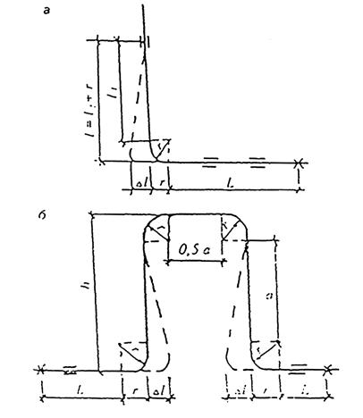 где Δl3 - максимально допустимое продольное перемещение трубопровода от действия температуры, которое может быть компенсировано отводом, м; l1 - длина прилегающего к отводу прямого участка трубопровода до подвижной опоры, м; r - радиус изгиба отвода, м; D - наружный диаметр труб, м; [σ] - расчетная прочность, МПа; Eo - модуль упругости, МПа. Схемы гнутого отвода и компенсатора показаны на рисунке 9.3. Рис.9.3. Схемы гнутого отвода и компенсатора: 9.4.6. Компенсирующая способность П-образного компенсатора определяется по формуле