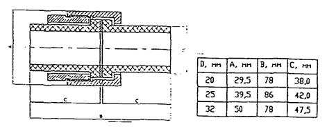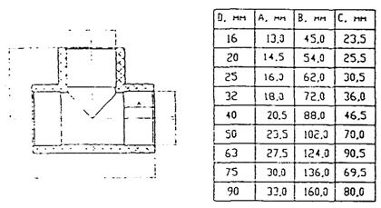 Кроме раструбных стыков с резиновыми кольцами, для сборки труб и фасонных частей из ПВХ могут использоваться клеевые соединения, а для трубных изделий из полиэтилена - соединения, выполненные контактно-раструбной сваркой. В настоящее время при строительстве зданий массовых серий технологией монтажа канализационных трубопроводов в построечных условиях не предусматриваются склеивание и сварка, являющиеся более сложными и трудоемкими процессами по сравнению со сборкой разъемных соединений с резиновыми кольцами. Сварка полиэтиленовых труб с раструбными патрубками, приварка боковых отводов к двухплоскостным крестовинам из ПЭ и ПП, а также работы по склеиванию трубных деталей из ПВХ выполняются на заводах-изготовителях, трубозаготовительных предприятиях, в специализированных цехах и мастерских. В отдельных случаях на строительных объектах при проведении работ в небольших объемах допускается применение клеевой технологии для соединений канализационных труб и фасонных частей из ПВХ при обязательном соблюдении необходимых мер по безопасности труда и требований пожарной безопасности. 10.2. Технология сборки соединений.10.2.1. Сборка раструбных соединений канализационных труб и фасонных частей из ПВХ, ПП, ПНД и ПВД производится путем введения гладкого конца трубы или хвостовика фасонной части в раструб второй трубной детали до монтажной метки, определяющей глубину вдвигания. Установка гладкого конца трубы до метки обеспечивает между торцом гладкого конца трубы и упорной поверхностью раструба зазор, используемый для компенсации температурных удлинений трубопровода. Рекомендуемые расстояния от торца гладкого конца трубы или хвостовика фасонной части до монтажной метки приведены в табл. 10.10. Табл. 10.10.Расстояние до монтажной метки для канализационных труб и фасонных частей отечественного производства