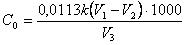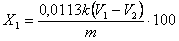 где 0,0113 - масса низкомолекулярных соединений, соответствующая 1 см3 раствора гидроокиси натрия молярной концентрации точно с (NaOH) = 0,1 моль/дм3, г/см3; k - коэффициент поправки раствора гидроокиси натрия молярной концентрации с (NaOH) = 0,1 моль/дм3; V1 - объем раствора гидроокиси натрия молярной концентрации с (NaOH) = 0,1 моль/дм3, израсходованный на титрование пробы контрольного опыта, см3; V2 - объем раствора гидроокиси натрия молярной концентрации с (NaOH) = 0,1 моль/дм3, израсходованный на титрование анализируемого экстракта, см3; V3 - объем экстракта, взятый для испытания, см3. В мерные колбы вместимостью 100 см3 из бюретки помещают 20, 30, 40, 50, 60, 70, 80, 90 и 100 см3 экстракта с известной массовой концентрацией низкомолекулярных соединений, объем раствора во всех колбах доводят до метки дистиллированной водой и перемешивают. Одну кювету интерферометра заполняют дистиллированной водой, вторую последовательно анализируемыми растворами. Кюветы помещают в термокамеру прибора, заполненную дистиллированной водой, и после установления четкой картины интерференционных полос совмещают верхнюю и нижнюю части интерференционной картины и снимают показания микрометрического винта. Нуль прибора устанавливают при заполнении обеих кювет дистиллированной водой. По полученным данным строят градуировочную зависимость, откладывая по оси абсцисс массу низкомолекулярных соединений в миллиграммах, по оси ординат - показания микрометрического винта. Градуировочная зависимость аппроксимируется линейным уравнением: