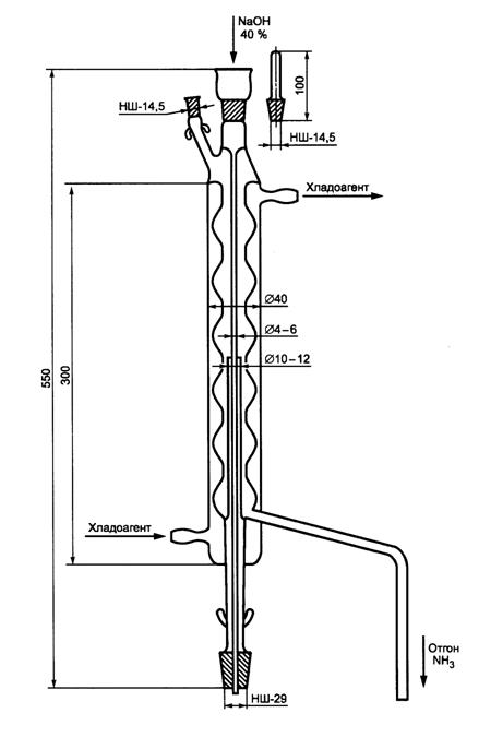 где т1 - масса остатка после высушивания экстракта, г; т - масса навески испытуемого материала, г; W - массовая доля воды, определяемая по 3.1.4.1, %. За результат испытания принимают среднеарифметическое значение результатов двух параллельных определений, выполненных по 3.1.5, расхождение между которыми не должно превышать значений предела повторяемости rабс. Предел повторяемости rабс - 0,1 %, предел воспроизводимости Rабс - 0,4 % при доверительной вероятности Р = 0,95. Результаты испытаний заносят в протокол испытания, оформленный в соответствии с приложением А. 4. Методы определения массовой доли водорастворимых низкомолекулярных соединений4.1. Объемный метод (метод 2)Метод основан на извлечении низкомолекулярных соединений путем экстракции кипящей водой с последующим превращением их в сульфат аммония и определением массовой доли общего азота по методу Кьельдаля. Метод позволяет определять массовую долю низкомолекулярных соединений в диапазоне от 1,5 % до 5,0 %. 4.1.1. Отбор проб Отбор проб полиамида 6 - по документации на материал [4] - [7]. Отбор проб полиамидных волокон- по ГОСТ 6611.0 и ГОСТ 10213.0. Отбор проб полиамидных (капроновых) технических (кордных) тканей - по ГОСТ 23785.0 и ГОСТ 29104.0. Для определения массовой доли низкомолекулярных соединений отбирают пробу полиамида 6, полиамидных волокон или тканей массой около 75 г. 4.1.2. Аппаратура, материалы, реактивы Для проведения испытания применяют: - весы специального (I) класса точности по ГОСТ 24104, наибольший предел взвешивания (НПВ) - 200 г, цена деления (d) - 0,0001 г; - шкаф сушильный, поддерживающий температуру (75 ±5)°С; - аппарат для встряхивания; - плитку электрическую закрытого типа мощностью 1 кВт; - прибор для отгонки аммиака (аналогично ГОСТ 16922), состоящий из перегонной круглодонной колбы К-2-500-34 ТХС или К-1-500-29/32 ТС по ГОСТ 25336; каплеуловителя КО-100 ХС (КО-14/23-100) по ГОСТ 25336; холодильника шарикового ХШ-3-300 ХС по ГОСТ 25336; воронки ВД-3-50 ХС по ГОСТ 25336 и колбы приемника - колбы Кн-2-500-34(40) ТХС по ГОСТ 25336 с нанесенной меткой на 250 см3; - колбы К-1-250-29/32 ТС по ГОСТ 25336; - холодильники шариковые ХШ-1-300 (400)-29/32 ХС по ГОСТ 25336; - колбы Кн-1-250-29/32 ТС по ГОСТ 25336; - колбы Кьельдаля 1-500-29/32 ТС по ГОСТ 25336; - воронки В-75-110 (80) ХС по ГОСТ 25336; - цилиндры 1 (3)-50, 1 (3)-100, 1 (3)-250 по ГОСТ 1770; - пипетку 2-2-10 по ГОСТ 29169; - бюретки 1-1 (3)-2-10-0,05; 1-2 (3)-2-25-0,1 по ГОСТ 29251, ГОСТ 29252; - стаканчики СН-60/14 по ГОСТ 25336; - эксикатор 2-190 (250) по ГОСТ 25336; - кислоту серную по ГОСТ 4204, х.ч., концентрированную и раствор молярной концентрации с (1/2 H2S04) = 0,1 моль/дм3; - натрия гидроокись по ГОСТ 4328, раствор молярной концентрации с (NaOH) = 0,1 моль/дм3 и раствор с массовой долей 40 %; - воду дистиллированную по ГОСТ 6709; - спирт этиловый ректификованный технический высшего сорта по ГОСТ 18300; - калий сернокислый по ГОСТ 4145, х. ч.; - медь (II) сернокислую 5-водную по ГОСТ 4165, ч. д. а.; - цинк гранулированный; - индикатор смешанный, приготовленный растворением 0,125 г метилового красного и 0,082 г метиленового синего в 100 см3 этилового спирта; - катализатор, приготовленный следующим образом: 100,00 г сернокислого калия и 0,60 г сернокислой меди тщательно растирают в фарфоровой ступке или размалывают на мельнице любого типа. Допускается для отгонки аммиака использовать универсальный холодильник (приложение Б). Нижняя отводная трубка холодильника должна быть оттянута и доходить почти до дна колбы-приемника. Допускается применять другие средств