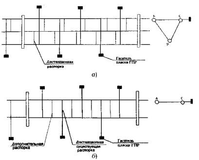 При установке гасителей пляски проводов ГПР на фазу, расщепленную на два провода, для обеспечения жесткости фазы на кручение устанавливаются дополнительные дистанционные распорки (см. рисунок 5, б).