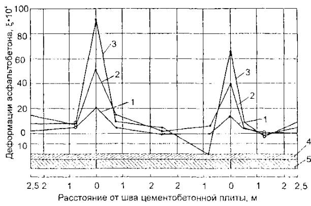 Рис. 1.1. Распределение деформаций в асфальтобетонном слое усиления относительно швов существующего покрытия: 1 - при понижении температуры от +15° до +10°С; 2 - при понижении температуры до -1°С; 3 - при понижении температуры до -15°С; 4 - асфальтобетонное покрытие; 5 - существующее цементобетонное покрытие ■ Температурно-влажностные воздействия: а) напряжения и деформации (особенно верхнего слоя) из-за перепадов температур; б) расслаивание конструкции, разрушение слоев при замерзании и оттаивании влаги и особенно при влиянии раствора антигололедных реагентов, проникающих через трещины верхнего слоя; в) передача растягивающих напряжений в верхний слой из нижнего слоя за счет сцепления слоев в результате температурного раскрывания трещин; г) дефекты конструктивных элементов (обнаженные арматуры, некачественные деформационные швы и др.), являющиеся концентраторами напряжений в нижнем слое и воздействующими на верхний слой; ■ Эксплуатационные воздействия: а) напряжения растяжения при изгибе при положении нагрузки над и в стороне от трещин в нижнем слое; б) срезывающие напряжения, вызываемые образованием «ступеньки» в нижнем слое при приложении нагрузки в стороне от трещин; в) неравномерные вертикальные перемещения плит (в том числе взаимные) при некачественном состоянии основания (просадки и переувлажнение) - неизбежные при усилении эксплуатируемых длительное время жестких покрытий; г) эффект газодинамического воздействия, проявляющийся в отрыве слоя асфальтобетона, возникающий при обтекании поверхности покрытия, имеющего трещины, и создающий перепад давлений, стремящийся поднять слой асфальтобетона. Поэтому проекты новых нежестких слоев усиления должны предусматривать меры, предотвращающие явление отраженного трещинообразования. Сюда входит повышение (до определенных пределов) толщины слоя усиления; применение специальных составов асфальтобетонных смесей, устройство разделительных прослоек в местах прохождения трещин старого покрытия; армирование слоев усиления, нарезка в нем деформационных швов. Обычно используют несколько из перечисленных мер одновременно. В отечественной практике проектирования аэродромов считают нежелательным применять нежесткие слои усиления, если планируется их эксплуатация воздушными судами с низкорасположенными реактивными двигателями большой мощности, например, ИЛ-86. Если устройство таких слоев в указанных условиях все же необходимо, толщину слоев усиления рекомендуется принимать не менее 15 см для аэродромов класса А и Б. Асфальтобетонные покрытия не допускается устраивать на участках, воспринимающих длительное (свыше 3-х мин.) воздействие газовой струи от реактивных двигателей воздушных судов, где температура на поверхности превышает 100°С, а скорость газового потока 50 м/с и выше. Известно, что воздушные суда с реактивными двигателями предъявляют повышенные требования к температуроустойчивости и износоустойчивости верхних слоев покрытия, а также особые требования к чистоте покрытий, что существенно влияет на безопасность эксплуатации реактивных воздушных струй. Особенно подвержены разрушениям при продолжительном воздействии газовых струй, как отмечено выше, покрытия нежесткого типа, построенные с применением органических вяжущих. В результате воздействия струй происх