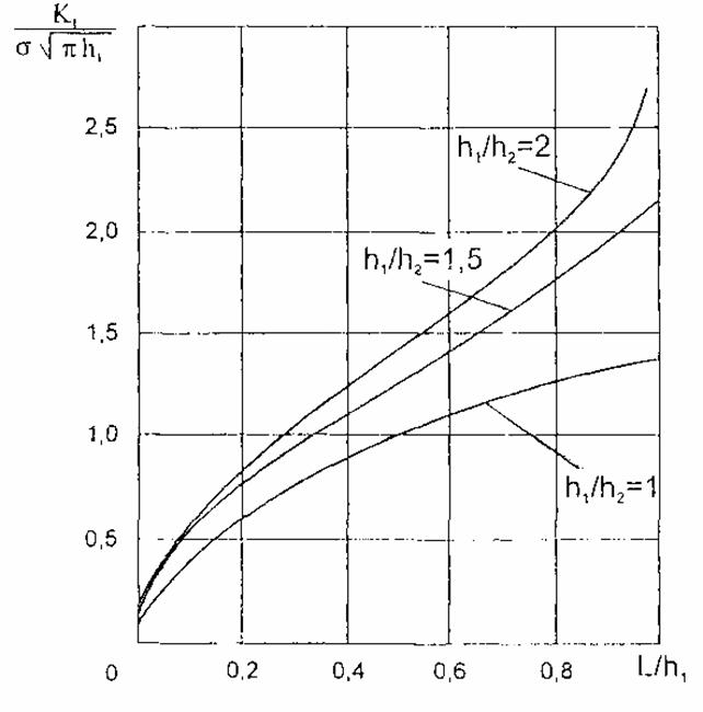 Рис. 3.2. Влияние отношения толщин слоев цементобетона (h1) и асфальтобетона (h2) на коэффициент интенсивности напряжений (К1): L -длина трещины; а - напряжение; Е1 = 35000 МПа.; Е2 = 1000 МПа ; Е3 = 35 МПа Как следует из приведенных на рис. 3.2 графиков, при фиксированной толщине слоя асфальтобетона и постоянных напряженных вдали от трещины уменьшение толщины цементобетона приводит к снижению безразмерного коэффициента интенсивности напряжений (при постоянной относительной длине трещины L/M) и тем самым - к увеличению критической длины трещины и повышению долговечности покрытия. Этот вывод в определенной степени согласуется с результатами теоретических и экспериментальных исследований Ленинградского филиала СоюздорНИИ в части рекомендуемого принципа равенства толщин верхних слоев или слоев усиления из асфальтобетона толщине грунта цементного основания - или усиливаемого цементобетонного покрытия, полученного, правда, на иных расчетных предпосылках [1]. Практически важными вопросами являются метод для расчета усталостной долговечности (число циклов приложения нагрузок до разрушения) асфальтобетонных слое на многослойных конструкциях с поверхностной или центральной трещиной и исследование влияния на это число циклов геометрических параметров (толщина слоев, размер и местоположение начальной трещины) и физико-механических свойств материалов слоев. За последние годы предложено около 40 различных полуэмпирических формул для определения скорости роста усталостных трещин, предполагающих знание от 2 до 6 различных констант материала [5]. Отметим, что одной из наиболее общих формул для оценки скорости роста усталостных трещин при умеренных частотах нагружения является [14].