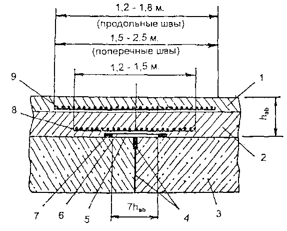 Рис. 4.2. Конструкция двухслойного асфальтобетонного слоя усиления в зоне нарезки деформационного шва: 1 - паз деформационного шва в слое усиления, заполненный герметиком; 2 - шнур уплотнения (в пазе шва); 3, 4 - соответственно верхний и нижний слои асфальтобетона; 5 - существующее жесткое покрытие; 6 - шов расширения; 7 - сетка сплошного армирования верхнего слоя асфальтобетона; 8 - трещина в асфальтобетоне На участках, где расстояние между швами или трещинами в существующем покрытии хотя бы в одном направлении меньше 4 м применяют сплошное армирование. Его следует также использовать на участках размещения основных опор воздушных судов при стоянке или запуске авиадвигателей. В остальных случаях допускается ленточное армирование над швами и трещинами (рис. 4.3). В последние годы наиболее широкое применение в асфальтобетонных слоях покрытий и усиления для борьбы с трещинообразованием получили нетканые материалы или геотекстиля. Наиболее эффективно применение тонких (3-6 мм) синтетических тканей, пропитанных битумополимером. Наблюдения показали, что укладка геотекстилей и водонепроницаемых мембран замедляет трещинообразование в слоях усиления толщиной 5 и 10 см. Оптимальные результаты были получены при использовании водонепроницаемых мембран. Так, наличие мембраны из нетканного материала способствует раздельной работе нижнего и верхнего слоев покрытий под воздействием температурных напряжений, препятствует возникновению отраженных трещин в верхних слоях, создает водонепроницаемый барьер, препятствующий проникновению влаги в нижние слои покрытия и основания. Имеются данные об использовании материалов из геотекстиля типа Петромат, Петротак, Flexiplast и других. При этом ткань типа Петротак используется при ямочном ремонте и при перекрытии старых покрытий асфальтобетоном. Для предотвращения образования «отраженных» трещин в асфальтобетонных слоях, уложенных поверх цементобетонных, стали использовать трехслойную систему различной плотности. Основной слой системы, укладываемый непосредственно на старое покрытие, выполняется из открытой асфальтовой смеси, включающей только дробленые каменные материалы и небольшое количество (1,6-2,5 %) битума. Толщина слоя обычно принимается 7,5-9,0 см. Наличие большого количества соединяющихся пор (20-35 %) в значительной степени гасит возникающие подвижки и деформации старого цементобетонного покрытия. На пористый слой укладывается выравнивающий слой толщиной 5 см из плотных асфальтовых смесей, а на него слой износа толщиной 3,7 см. Устройство слоев осуществляется стандартными средствами механизации. Отличительной особенностью использования асфальтобетонных слоев усиления на цементобетонных покрытиях является в ряде случаев значительная толщина слоя усиления. Так, в докладе на XIII Международном дорожном конгрессе приведены следующие данные по применяемым толщинам асфальтобетонных дорог и аэродромов: