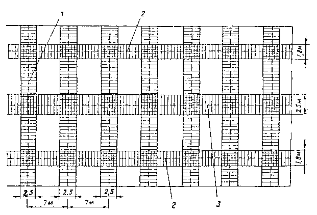 Рис. 4.3. Схема ленточного армирования асфальтобетона: 1 - поперечный шов; 2 - продольный шов; 3 - осевой шов Япония - до 30 см, Бельгия - 22 см, Голландия - 20 см, Италия - 20 см, Швейцария - 18 см, Великобритания - 17 см. Для предотвращения разрушений и восстановления поверхности асфальтобетона при воздействии высокотемпературных газовых струй и пролитых топлив целесообразным и экономичным является устройство дополнительных термоизоляционных защитных слоев, обладающих эрозионной стойкостью и низкой теплопроводностью. Материалы этих слоев должны обладать необходимой тепло- и морозостойкостью, а также химической стойкостью к авиационным, топливам, маслам и специальным жидкостям; иметь достаточную прочность, деформативность, износостойкость и хорошую адгезию к цементному и асфальтовому бетону при совместной работе защитных слоев с нижележащим покрытием под влиянием самолетных нагрузок и природно-климатических факторов. Кроме того, структура поверхности защитных слоев должна обеспечивать необходимое сцепление с пневматиками авиаколес [9, 11, 12]. Устройство термоизоляционных защитных слоев на эксплуатируемых и вновь построенных покрытиях по данным мировой практики осуществляют двумя способами: сращиванием с незатвердевшим только что уложенным слоем и укладкой слоев на существующие покрытия преимущественно тонкими слоями (до 40 мм). Для создания термоизоляционных защитных слоев могут быть использованы материалы типа пластобетонов на основе полимерных связующих: эпоксидных и полиэфирных смол, смол на формальдегидной и фурановой основе, а также комбинированных смол, например типа эпоксиднодегтевых и каменноугольных или эпоксиднобитумных компаундов и др. Толщина термоизоляционных слоев в зависимости от интенсивности и частоты приложения высокотемпературных нагрузок может колебаться в пределах от 5-8 до 15 мм. и более. Из материалов, пригодных для термоизоляционных защитных слоев, наиболее перспективны термоэрозионные пластмассы на основе термореактивных смол. Эти материалы не разрушаются под воздействием высокотемпературной газовой струи и не теряют прочностных свойств при относительно высоких (до 200-300 °С) температурах. Они могут быть нанесены как методом укладки, так и методом напыления или набрызга на больших площадях в виде тонкого слоя [9, 11, 12]. Варианты рекомендуемых термостойких асфальтобетонных покрытий включают следующие разновидности конструкций (рис. 4.4):