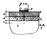 Примечание. Добавка в зологрунт цемента, извести или электролита повышает расчетные характеристики на 15 - 20 %. 4.3. Проектируемую конструкцию приводят к трехслойной системе (рис.2); при этом общий модуль упругости Е3, подстилающего монолитный слой полупространства определяют по ВСН 46-72. Если покрытие многослойное, то его модуль упругости Е1 определяют как средневзвешенный. 4.4. Рассчитывают слой из укрепленных материалов на растяжение при изгибе. Для этого сначала определяют эквивалентную упругую характеристику Lэкв двухслойной плиты (покрытие + основание из монолитного материала) по формуле: