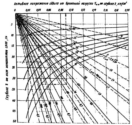 где τа.м. максимальное активное напряжение сдвига от временной расчетной нагрузки в полупространстве; τа.в. - то же от собственной массы дорожной одежды определяется по рис. 10 ВСН 46-72); τдоп - допускаемое напряжение сдвига в зернистом слое, подстилающем монолитный слой, или в грунте земляного полотна. Активное напряжение сдвига τа.м