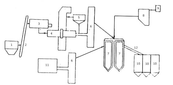 Технологическая схема приготовления местного шлакового вяжущего: 1 - дробилка; 2 - питатель; 3 - сушильный барабан; 4 - мельница; 5 - сепаратор; 6 - шахты; 7 - смесительные силосы; 8 - фильтр; 9 - вентилятор; 10 - силосы для вяжущего: 11 - силос цементной пыли; 12 - аэрожелоб