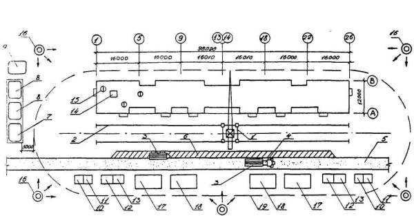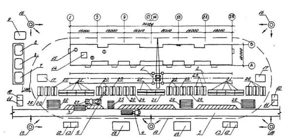 план монтажной площадки при монтаже со склада: Краткие указания по сварке стыков сборных элементов при монтаже крупнопанельных домов серии 125Электросварку закладных деталей в стыках сборных железобетонных элементов крупнопанельных домов следует выполнять в соответствии с указаниями, данными в рабочей документации привязанного проекта, а также с требованиями СНиП III-16-80, СНиП III-4-80 и других действующих нормативных документов по сварочным работам. К работам по сварке закладных деталей допускаются сварщики, прошедшие специальное обучение и сдавшие экзамен. Сварщики должны иметь удостоверения, устанавливающие их квалификацию и характер работ, к которым они допущены. Выполнение сварных соединений осуществляется под руководством лица, имеющего специальную подготовку по производству сварочных работ. Сварщик должен иметь индивидуальное оснащение: электрододержатель (ГОСТ 14651-78*Е), стальные щетки, зубило, молоток с одним концом в виде зубила, светофильтры, щиток или маску, защитные прозрачные стекла и спецодежду. В процессе монтажа крупнопанельных домов применяется в основном дуговая ручная сварка протяженными однослойными и многослойными швами. Для дуговой сварки закладных деталей используют электроды с качественными покрытиями. Тип и марка электродов (ГОСТ 9466-75 и 9467-75) принимается согласно указаниям в рабочей документации, ППР и технологических картах и удостоверяется паспортами или сертификатами заводов-поставщиков. После длительного хранения или в случае увлажнения электроды перед сваркой необходимо прокалить в электрической печи. В качестве источника сварочного тока в нормокомплекте, разработанном для производства монтажных работ по домам серии 125, предусмотрен сварочный трансформатор ТС-500. Наружные поверхности и кромки закладных деталей, подлежащие сварке, должны быть очищены от наплывов бетона и раствора, от ржавчины, грязи, пятен масла и краски, в зимнее время - от льда и снега. Сварочное оборудование, рабочее место сварщика, а также свариваемые соединения должны быть защищены от дождя, снега, ветра и хорошо освещены дневным или искусственным светом. Собранные на монтаже узлы железобетонных элементов крупнопанельного дома скрепляются при помощи прихваток. Прихватки должны выполняться электродами с теми же покрытиями, которые предусмотрены для сварки рабочими швами, но меньшего диаметра. Прихватки имеют длину сварного шва 20-25 мм, высоту шва 4-5 мм. Прихватки размещают в пределах расположения рабочих швов и при сварке переплавляют. Швы накладывают после зачистки ранее сделанных прихваток от шлака и брызг металла. Сварные швы должны иметь гладкочешуйчатую поверхность без наплывов и плавный переход к основному металлу. Наплавленный металл должен быть плотным, однородным по всей длине шва, без трещин и кратеров. При сварке закладных деталей допускаются поры - не более 3 шт. диаметром до 2 мм на длину шва в 100 мм при расстоянии между ними не менее 10 мм и шлаковые включения - протяженностью не более 10 мм на длине 100 мм. Отклонения размеров сварных соединений от проектных и смещение осей стержневых накладок в стыках не должны превышать допусков, установленных в нормативных документах. Применение непроектных стальных накладок и связей, устройство не предусмотренных чертежами подкладок или вставок между сварива