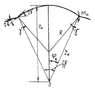 Результаты проведенных теоретических и экспериментальных исследований позволили сделать следующие основные выводы по технологическим параметрам правки концевых участков полотнищ: а) ширина зоны правки от начальной или конечной кромок полотнища должна находиться в пределах 1600 - 2000 мм б) для получения после правки остаточной кривизны близкой к проектной по всей высоте стенки, радиус обратного изгиба для различных поясов должен быть различен. Этим технологическим требованиям должны удовлетворять применяемые способы и устройства по правке концевых участков. Наиболее идеальной схемой правки представляется правка с помощью сектора, оснащенного сменными дугами различной кривизны и длиной около 2 м. Переставляя сектор с помощью крана на каждый пояс и используя сменные дуги соответствующей кривизны можно осуществить хорошую правку концевых участков шириной ~ 2 м на всю высоту стенки. Опыт применения приспособления в виде каркаса с шаблонами постоянной кривизны, обеспечивающего обратный изгиб конца полотнища одновременно на всю высоту стенки, показывает возможность получения удовлетворительных результатов правки обратным изгибом на один радиус, соответствующий необходимому радиусу правки нижних поясов. На основе этого опыта можно сделать вывод о том, что при правке обратным изгибом полотнищ переменной толщины можно ограничиться двумя-тремя радиусами обратного изгиба, что необходимо принимать во внимание при дальнейшем совершенствовании устройств для правки, ЛИТЕРАТУРА 1. Никиреев В.М., Ритчик Г.А. К вопросу рулонирования полотнищ переменной толщины. - Сборник трудов ВНИИМСС. Исследование методов сварки. Процессы монтажа резервуаров, М., 1979. 2. Сахненко В.М. Холодная гибка и правка деталей. М., Машгиз, 1951. КОНЦЕНТРАЦИЯ ДЕФОРМАЦИЙ В МОНТАЖНОМ СТЫКЕ СТЕНКИ ЦИЛИНДРИЧЕСКОГО РЕЗЕРВУАРАКанд. техн. наук В.М. Никиреев 1. В стенках вертикальных цилиндрических резервуаров, выполненных из рулонных заготовок, встречаются монтажные стыки, у которых кольца соседних полотнищ соединены под небольшим углом. При заполнении резервуара в этих стыках возникают значительные местные напряжения и деформации. При большом количестве циклов налива и слива продукта в монтажных стыках, имеющих угловатость, наблюдаются случаи нарушения герметичности стенки в связи с малоцикловой усталостью металла. Для определения допустимого числа циклов налива и слива продукта необходимо установить зависимость коэффициента концентрации деформаций в упомянутом монтажном стыке от величины угла стыковки концов соединяемых полотнищ. В дальнейшем будем этот угол обозначать через 2 γ. Наиболее часто монтажные стыки имеют угловатость в средней зоне стенки - на уровне 3 - 6 поясов. В этой зоне мало сказываются влияния нижнего и верхнего уторных соединений стенки и поэтому при анализе деформаций в угловатых монтажных стыках будем пренебрегать влиянием уторов. Рассмотрим замкнутую полосу единичной ширины толщиной δ, состоящей из п одинаковых круговых полос радиуса R, соединенных между собою под углом 2γ. Из условия равенства периметра кругового пояса цилиндрического резервуара проектного радиуса Ro и периметра упомянутой замкнутой полосы получим зависимость (рис. 1)