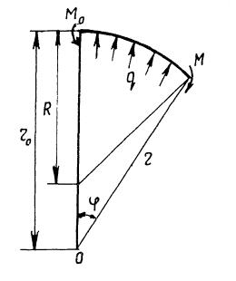 Точка 0 - начало полярной системы координат - совпадает с центром замкнутой полосы, Мо - изгибающий момент в середине круговой полосы (φ - 0). Используя известную зависимость M = EJ(1/ρ - 1/R) и дважды интегрируя уравнения (1), (2) с учетом равенства ds2 = dr2 + (rdφ)2 и граничных условий (см. рис. 1), получим два уравнения для определения ro и rк