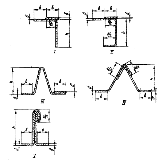 Рис 1. - Геометрические размеры несущих элементов Во всех опытных или серийных покрытиях, где были использованы эти профили, применялась одна и та же схема радиально размещенных несущих элементов, которые при симметричном нагружении покрытия воспринимали изгибающие и сжимающие усилия. Это обстоятельство определило в данном случае способ сопоставления различных профилей по моменту сопротивления изгибу при равенстве площадей и толщин сравниваемых профилей. В данной статье рассмотрены только те профили, которые были уже использованы в опытных или серийных покрытиях. В связи с тем, что некоторые типы сечений весьма близки друг другу по конфигурации, было обращено особое внимание на одинаковость способа определения границ сечения и размеров включенной в расчетную формулу части оболочки. На рис. 1 представлены сечения тех профилей, которые рассмотрены в этой статье. При определении моментов инерции сечения в формулах были отброшены члены, имеющие небольшую величину и не влияющие на общий результат.