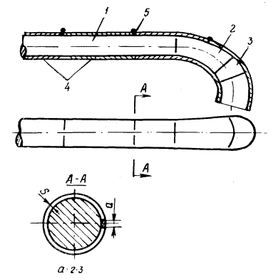 где Р - усилие протяжки отводов; М - изгибающий момент в сечении; F0 - площадь опасного сечения; К - константа, характеризующая конструкцию сердечника. Таким образом, уменьшая площадь поперечного опасного сечения, мы тем самым пропорционально увеличиваем напряжение в этом сечении, и, следовательно, резко уменьшаем ресурс работы сердечника (стойкость сердечника определяется характеристикой длительной прочности материала сердечника [1]). В связи с этим исключается возможность протяжки толстостенных отводов из углеродистой стали с относительной толщиной стенки S/ДН > 0,1 и из нержавеющей и легированных сталей, а протяжка отводов с относительной толщиной стенки S/ДН < 0,1 приведет к значительному сокращению срока службы рогообразного сердечника со сквозной полостью.