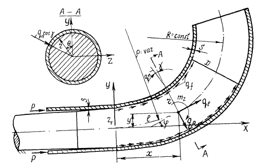 Схема процесса протяжки отвода на рогообразном сердечнике: r - радиус сечения сердечника вдоль средней линии; φ - угол между касательной к оси сердечника и осью X; θ - угол между r и осью У в поперечном сечении сердечника; l - длина оси сердечника от начала координат до рассматриваемой точки Проведенные исследования силовых условий процесса и напряженного состояния рогообразного сердечника показали, что при горячей протяжке отводов в инструменте возникают значительные по величине нормальные растягивающие напряжения, особенно в сечении, расположенном в начале формообразующего участка сердечника [1], Таким образом, именно величина этих растягивающих напряжений будет определять прочность инструмента в целом (стойкость сердечника). Рассматривая сердечник как брус большой кривизны оси, величину максимальных растягивающих напряжений в сечении, расположенном в начале формообразующего участка, можно определить, используя теорию сопротивления материалов [2]: