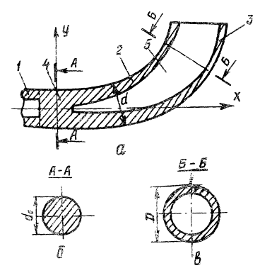 Рис 1. Конструкция равнопрочного рогообразного сердечника а - общий вид рогообразного сердечника, б - сечение А-А по границе опасного сечения; в - сечение Б-Б по границе формообразующего и калибрующего участков В связи с этим разработан равнопрочный рогообразный сердечник для протяжки отводов до Дн = 880 мм, в котором масса снижена на 40 - 50 %, и он не уступает по своим прочностным характеристикам сердечнику со сплошным сечением по всей длине. Конструкция равнопрочного рогообразного сердечника представлена на рис. 1. Рогообразный сердечник содержит направляющий участок 1, формообразующий 2 и калибрующих 3. На границе перехода направляющего участка в формообразующий (опасное сечение сердечника) симметрично относительно упомянутой границы расположена зона 4 сплошного сечения. Оставшийся формообразующий участок и весь калибрующий выполнены с внутренней полостью 5. Проведенные исследования напряженного состояния сердечника с полостью, начинающейся от начала формообразующего участка, показали, что для создания равнопрочного сердечника необходимо, чтобы опасное сечение было сплошным, а толщина стенки формообразующего участка равномерно уменьшалась от dо/2 в начале участка до нуля в его конце. Из конструктивных соображений и из технологии литья полых заготовок толщина стенки калибрующего участка не может быть меньше dо/10 (dо - наружный диаметр направляющего участка). Из технологических условий процесса литья, а также для создания запаса прочности опасного сечения в зоне перехода направляющего участка в формообразующий должна быть зона сплошного сечения на длину не менее диаметра dо расположенная симметрично относительно упомянутой границы. Предложенный сердечник является равнопрочным по всей длине и имеет массу на 40 – 50 % меньше, чем масса сердечника со сплошным сечением. Рогообразный сердечник для заготовлений крупногабаритных отводов Предварительные технико-экономические расчеты показывают, что наиболее прогрессивным способом изготовления крутоизогнутых отводов большого диаметра до 1020 мм является способ горячей протяжки электросварных труб по рогообразному сердечнику. Такой способ по сравнению с существующими обеспечивает значительную экономию металла, снижение трудоемкости и себестоимости изделий. Так, например, трудоемкость изготовления отводов 1020×10 мм методом горячей протяжки в 30 раз ниже, чем изготовление их секционными и в 15 раз ниже, чем в штампосварном варианте. Некоторыми зарубежными фирмами организовано изготовление крупногабаритных отводов горячей протяжкой по рогообразному сердечнику: австрийская фирма "Эрне" осуществляет протяжку отводов диаметром до 1000 мм из бесшовных и электросварных труб; французская фирма "Валлурех", английская "Мунро и Миллер" осуществляют выпуск отводов подобным способом до 800 мм. В настоящее время ВНИИмонтажспецстрой совместно с другими организациями разрабатывает технологию и оборудование для изготовления крупногабаритных отводов до 1200 мм методом горячей протяжки по рогообразному сердечнику. В связи с этим встает вопрос о разработке основного деформирующего инструмента данной технологии - рогообразного сердечника. Литой рогообразный сердечник со сплошным сечением по всей длине неприемлем при изготовлении крупногабаритных отводов, так как невозможно получить 