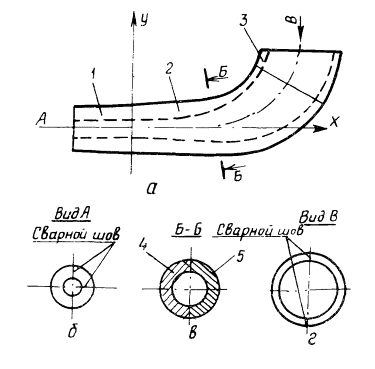 Рис. 2. Конструкция рогообразного сердечника для изготовления крупногабаритных отводов: а - общий вид рогообразного сердечника; б - вид А начала направляющего участка; в - сечение Б-Б формообразующего участка; г - вид В конца калибрующего участка Изготовление отдельных частей сердечника связано с трудоемким и сложным процессом установки и крепления стержня при литье, в результате чего получается много брака. Наличие сварных швов по сечениям, нормальным к оси сердечника, которые работают на отрыв от изгибающего момента и усилия протяжки, резко снижает стойкость рогообразного сердечника, что выражается в снижении срока его службы. В связи с этим разработан рогообразный сердечник для протяжки крупногабаритных отводов Дн = 720 - 1220 мм, который выполнен составным из отдельных частей, не требующих между собой сварки. Конструкция рогообразного сердечника представлена на рис. 2. Рогообразный сердечник содержит направляющий 1, формообразующий 2 и калибрующий участок 3 и выполнен составным из двух частей 4 и 5, симметричных относительно плоскости, проходящей через среднюю линию сердечника. Выполнение сердечника составным сокращает технологию литья этих частей и изготовления сердечника. Каждая из симметричных половин не имеет полости и тем самым снимаются проблемы установки и крепления от смещения при литье длинномерного стержня внутри сердечника, а, следовательно, снижается вероятность брака. Во время протяжки трубы-заготовки по рогообразному сердечнику на него действуют поверхностно распределенные силы нормального давления и трения. В любом сечении, нормальном к оси сердечника, эти силы симметричны относительно плоскости, проходящей через эту ось, и поэтому результирующая этих сил будет сжимать между собой указанные симметричные части сердечника и не давать смещаться им относительно друг друга. Следовательно, нет необходимости неразъемно соединять их между собой сваркой, и поэтому указанный рогообразный сердечник будет работать аналогично литому сердечнику. Отсутствие сварных швов резко увеличивает стойкость сердечника, что выражается в увеличении его срока службы. Для исключения вероятности смещения симметричных частей сердечника относительно друг друга во время крепления их к штанге пресса возможна сварка этих частей в торцевых плоскостях (начало направляющего и конец калибрующего участков) (см. рис. 2 б, г). Для получения высококачественного литья мелкозернистой структуры и в соответствии с технологией литья рогообразных сердечников площадь каждого последующего поперечного сечения сердечника от направляющего участка к калибрующему не превышает площади предыдущего поперечного сечения. Это улучшает качество литья и тем самым повышает стойкость сердечника. Предложенный сердечник позволяет увеличить срок службы в 3 - 5 раз, улучшить качество и упростить технологию изготовления. ЛИТЕРАТУРА 1. Овчинников А.Г., Куренков В.А. и др. Повышение прочности рогообразных сердечников.- В кн.: Монтажные работы в строительстве. Труды института. Вып. XI, М., 1974 г. (Минмонтажспецстрой, ВНИИмонтажспецстрой). 2. Авторское свидетельство СССР № 856615, кл. В21Д 8/12 от 1978 г. 3. Заявка № 8829865/25-27, по которой вынесено решение о выдаче авт. свид. от 27.03.85 г. ОЦЕНКА НЕСУЩЕЙ СПОСОБНОСТИ ТРОЙНИКОВ, НАГРУЖЕННЫХ ВНУТРЕННИМ ДАВЛЕНИЕМКанд. техн. наук Г.М. Хажин