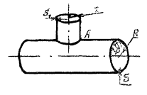 Рис. 1. Расчетная схема тройникового соединений трубопроводов Как доказывают многочисленные экспериментальные данные, наиболее нагруженной является т. А в меридиональном сечении тройника (рис. 1). Именно в этой точке начинается пластическое течение. Гидравлические испытания тройников показали, что, как правило, в этой зоне появляется меридиональная трещина. Поэтому представляет интерес оценка локального напряженно-деформированного состояния тройника именно в этой точке. Такой подход получил достаточно широкое распространение и, по-видимому, оправдан. Как показало тензометрирование тройников [1] нагруженных внутренним давлением, в т. А (см. рис. 1) напряженное состояние основной оболочки и штуцера близко к осесимметричному. Это дает возможность использовать решения для осесимметричных оболочек при расчете тройниковых соединений. Рассмотрим концентрацию напряжений у неподкрепленных отверстий в цилиндрических оболочках. При этом будем оценивать только окружные мембранные напряжения, которые достигают максимума в точке пересечения меридиональной плоскости симметрии с линией выреза. Решение для малого неподкрепленного выреза было впервые получено А.И. Лурье [2]:
