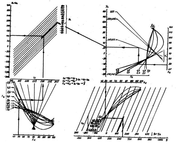 Модель можно использовать в пределах изменения факторов, указанных в табл. 1. Фактические и расчетные (по модели) данные по прочности швов труб приведены в табл. 4. Использование модели дает возможность контролировать и прогнозировать прочность сварного стыка при задаваемых параметрах сварки. Однако, она чрезмерно громоздка и неудобна для практических вычислений. Поэтому математическая модель была преобразована в номограмму (см. рисунок). Номограмма построена для трех факторов: х1 - температура нагревателя. °С; х2 - время оплавления торцов, с; х3 - давление стыковки труб при их сварке, кгс/см2 (МПа). Порядок определения прочности стыков, сваренных на различных режимах (х1; х2; х3)s можно проследить по нанесенному на номограмму ключу. Например, требуется определить прочность сварного соединения труб, сваренных на следующих режимах: - температура нагревателя 235°C - время оплавления торцов 50 с; - давление стыковки труб при их сварке 5,8 кгс/см2. Для этого на оси х2 (правый верхний квадрат) из точки, соответствующей времени оплавления торцов (в данном случае 50 с), проводим прямую перпендикулярно оси х2 до пересечения с соответствующей выбранному давлению стыковки труб при сварке (5,6 кгс/см2) кривой х3. Из точки пересечения параллельно оси х2, проводим прямую до пересечения с линией, соответствующей выбранной температуре нагревателя х1 (в нашем случае 235°С). Из найденной точки опускаем перпендикуляр на промежуточную ось yc. В левом верхнем квадранте проводим линию параллельно семейству линий ус, соответствующую полученному значению yc в правом верхнем квадранте. В нижнем левом квадранте из точки 50°С на оси х2 строим перпендикуляр до пересечения с соответствующей значению 5,6 кгс/см2 линией х3. Из найденной точки пересечения параллельно оси х2 проводим прямую до пересечения с линией х1, соответствующей значению 235°С, и далее перпендикулярно оси х2, проводим прямую до пересечения с построенной линией ус в верхнем левом квадранте. Значение точки пересечения определяем на промежуточной оси ус + yв. В соответствии с полученным значением проводим линию в правом нижнем квадранте параллельно семейству линий ус + yв. Аналогично предыдущим построениям на оси х2 (правый нижний квадрант) откладываем значение времени оплавления торцов, из этой точки проводим прямую перпендикулярно оси х2 до пересечения с соответствующей линией х3 и из полученной точки параллельно оси х2 проводим прямую до пересечения с ранее проведенной линией ус + yв. Перпендикуляр, опущенный из полученной точки на ось у, указывает искомую величину предела прочности при разрыве.