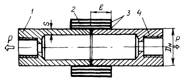 Рис. 3. Устройство для горячего отверждения клеевых соединений трубопроводов: 1 - ТЭНы; 2 – кожух; 3 - наборы сменных фланцев Таким образом, установлено, что прочность соединений при горячем отверждении клея выше, чем при холодном в среднем на 62 - 65 % для клея с отвердителем полиэтиленполиамином и на 44 - 48 % для состава с отвердителем Л-20. Дополнительный часовой прогрев соединений, отвержденных при нормальной температуре, позволяет улучшить прочностные показатели в среднем на 30 - 40 %. Для осуществления горячего отверждения клея в условиях строительно-монтажной площадки, а также повышения прочностных свойств клеевых соединений институтом разработано специальное устройство (рис. 3). Оно состоит из четырех ТЭНов мощностью 120 Вт каждый, заключенных в два полуцилиндра кожуха, шарнирно соединенных между собой. Устройство может работать от сети напряжением 36 и 220 В. Для закрепления устройства на трубах различных диаметров (Ду от 15 до 100 мм) оно снабжено набором сменных фланцев. Испытания устройства показали, что оно создает на поверхности стеклотекстолитового бандажа равномерное поле температур в заданных пределах (120 ± 3°С) и может быть использовано в реальных условиях монтажа. ЛИТЕРАТУРА 1. Кардашов Д.А. Синтетические клеи. - М.: Химия, 1976, -508 стр. 2. Позднышев B.C. Тавастшерна Р.И. Склеивание - перспективный метод соединения стыков труб. Монтажные и специальные работы в строительстве. 1982, № 8. 3. Протасов B.H., Агапчев В.И. Исследование прочностных свойств клеевых соединений в клиновых задвижках. - Транспорт и хранение нефтепродуктов и углеводородного сырья. Научн.-техн. сб. 1971, № 6, с. 11 - 13, 4. Чернин И.З., Смехов Ф.И. Влияние условий отверждения на адгезию и прочность соединений. Вестник машиностроения. 1975, № 5, с. 59-61. 5. Фрейдин А.С. Прочность и долговечность клеевых соединений. -М.: Химия, 1971; 256 с. ВОЗДЕЙСТВИЕ РАБОЧИХ ПАРАМЕТРОВ ТРУБОПРОВОДА НА СТОЙКОСТЬ КЛЕЕВЫХ СОЕДИНЕНИЙКанд. техн наук В.С. Позднышев, инженеры Л.И. Жлуктова, С.И. Филатова Технологические, прочностные и технико-экономические преимущества клеевых соединений определяют перспективы успешного их использования в практике монтажа стальных трубопроводов различного назначения. Наиболее прогрессивны клеевые соединения бандажного типа, разработанные лабораторией изготовления и монтажа технологических трубопроводов ВНИИмонтажспецстроя [1, 2]. Новизна конструктивно-технологических решений бандажных клеевых соединений, а также актуальная потребность в них монтажных организаций обуславливает необходимость получения характеристик их работоспособности. В связи с этим было получено аналитическое решение для качественной и количественной оценки напряженного состояния соединений при воздействии основных рабочих параметров трубопровода - внутреннего давления и температуры среды [3]; установлены экспериментальные зависимости, раскрывающие характер влияния геометрических размеров элементов соединений на несущую способность, а также выявлены условия оптимизации прочности соединений с учетом их реальной геометрии [4]. Однако широкое применение бандажных клеевых соединений сдерживается отсутствием данных об их работоспособности в условиях, приближенных к условиям монтажа и сдачи трубопроводов в эксплуатацию. Этому актуальному вопросу и посвящена данная статья. Из всех существующих мет