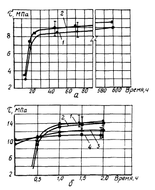 Рис. 2. Зависимость разрушающих напряжений сдвига от времени отверждения клеевых соединений: а - холодное отверждение при 20 ±3°С; б - горячее отверждение при 120 ±3°С (3, 4 - дополнительно после холодного отверждения в течение 24 ч); 1, 3 - композиции с полиэтиленполиамином, 2, 4 - композиции с полиамидным олигомером Л-20 Дополнительный часовой прогрев соединений, отвержденных в течение 24 ч при нормальной температуре увеличивает их прочность в среднем на 40 % для соединений с полиэтиленполиамином и на 32 % - с Л-20 (см. рис. 2, б). При этом кривые на графиках имеют пологий характер, без промежуточных максимумов. Прогрев соединений свыше 1 ч незначительно сказывается на увеличении их прочности. Так, двухчасовый прогрев по сравнению с одночасовым прогревом обеспечивает рост значений прочности для состава с ПЭПА в среднем на 5 %, а для состава с Л-20 - на 3 %. Прочность соединений горячего отверждения (время отверждения 1 - 1,5 ч) выше, чем прочность соединений холодного отверждения (время отверждения 72 ч) для клея с ПЭПА в среднем на 62 - 65 %, а для клея с Л-20 - на 44 - 48 %, Это можно объяснить тем, что при высокой температуре снижается вязкость композиции, а значит обеспечивается лучшая смачиваемость поверхностей склеивания, при этом повышается подвижность молекул олигомера и отвердителя, в результате чего ускоряется конверсия реакционноспособных групп и обеспечивается более высокое адгезионное сцепление. При горячем отверждении наиболее интенсивный набор прочности происходит в течение первого часа. Сопоставляя данные испытаний, можно сделать вывод, что соединения с полиамидным отвердителем менее чувствительны к высоким температурам отверждения, чем соединения отвердителем полиэтиленполиамином и пластификатором дибутилфталатом. Следует отметить, что с увеличением времени холодного и горячего отверждения одновременно с ростом значений прочности наблюдается снижение вариационного коэффициента, при этом для состава с ПЭПА его значения уменьшаются от 18,6 до 7,4, а для состава с Л-20 - от 16,6 до 6,2. Приведенный порядок цифр характеризует разброс показателей прочности, поэтому можно сделать вывод, что состав с отвердителем Л-20 более однороден, чем состав с ПЭПА.