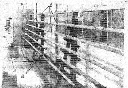 где Jх - момент инерции сечения; δ - толщина сечения. На. рис. 2 представлены кривые изменения α и β в зависимости от длины развертки заготовки. На кривых видно, что в ряде случаев характеристики сходных по очертаниям элементов оказываются весьма близкими по значению. Это позволяет выбирать в каждой конструкции тот тип профиля, который наиболее соответствует условиям работы сооружения. Примером может быть использование треугольных гофров, которые применялись в конструкциях крыш для резервуаров и зерновых силосов. Так как крыши для резервуаров, имеют небольшой угол подъема (около 7°), то целесообразно было использовать гофры типа III, которые позволяют применять упрощенную технологию изготовления и монтажа покрытия. Были выпущены проекты таких покрытий для резервуаров емкостью от 100 до 2000 м3. Сооружение и испытание таких покрытий на резервуарах емкостью 700 и 1000 м3 показали хорошее совпадение теоретических и экспериментальных данных, подтвердило правильность выбранной расчетной схемы. Треугольный гофр типа IV более удобен для конических крыш, имеющих большой угол наклона, поэтому этот тип гофров был выбран для крыши металлического силоса с углом подъема крыши 30°. При таком конусе нужно было обеспечить удобство образования конической поверхности покрытия и стыковка гофров в зоне вершины гофра облегчает решение этой задачи. Крыши для силосов с треугольными гофрированными элементами имеют следующие особенности по сравнению с крышами для резервуаров: 1) на крыше имеется промежуточное кольцо, которое соединяется специальным натяжным устройством с радиальными гофрами, образуя жесткое соединение; 2) число гофров неодинаково в разных зонах, оно уменьшается по направлению к вершине конуса после пересечения опорного кольца. Применение гофрированных элементов в покрытиях для силосов дало снижение массы покрытия на 25 % по сравнению с типовым проектом и позволило существенно сократить сроки возведения сооружения. Так же как и при испытаниях покрытия для резервуаров, совпадение теоретических и экспериментальных данных было удовлетворительное. Из всех рассмотренных профилей, наиболее выгодны по соотношению α и β профили типа I и II. Этот тип профилей широко применяется в конструкциях, работающих на изгиб (например, панелях), он применялся в покрытиях для резервуаров как в СССР, так и за рубежом. Достоинствами такого профиля являются: большая жесткость при изгибных напряжениях, простота изготовления, экономичность. Недостатком - небольшая крутильная жесткость, что требует принятия дополнительных мер по сохранности заготовки в процессе транспортировки и монтажа. Вариант сечения II более жесткий и более удобный при использовании в конструкции промежуточных колец или элементов, закрепляемых под крышей, на покрытии снизу. Покрытия типа V разработаны болгарскими специалистами для зерновых силосов и напоминают аналогичные покрытия промышленных зданий, в которых несущим элементом является ужесточенный замковым соединением узел стыковки листов. Такое покрытие отличается от рассмотренных выше отсутствием сварки и может быть изготовлено из тонкого листа, имеющего антикоррозионное покрытие. Толщина покрытия определяется мощностью фальцезакатного приспособления и пластичностью материала настила. Опыт применения таких покрытий 