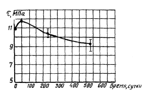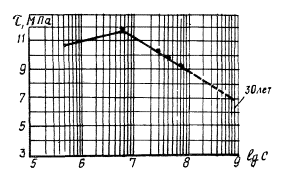 х) образец не разрушился. Таким образом, проведенные гидравлические испытания клеевых соединений с достаточной убедительностью свидетельствуют об их повышенной стойкости к кратковременным воздействиям статического и пульсирующего гидравлического давления, при этом при рабочем давлении до 1,0 МПа и температуре среды 90°С они могут работать с коэффициентом запаса по прочности, равным 4,2. При меньших температурах среды соединения могут работать при более высоких давлениях. Результаты испытаний клеевых соединений после длительного (18 мес.) циклического воздействие горячей (t = 85 ± 5°С) воды под давлением q = 0,2 - 0,3 МПа и постоянной растягивающей нагрузки Р = - 0,4 кН приведены на рис. 4, из которого следует, что такого рода воздействия вызывают изменение их прочностных свойств с характерным максимумом в пределах 50 суточного воздействия (τмакс = 11,9 МПа). За указанные периоды прочность образцов возросла в среднем на 10 %. Наличие максимума можно объяснить горячим доотверждением клеевых соединений, а также перераспределением напряжений в них вследствие развития релаксационных процессов. При дальнейших испытаниях проявляется тенденция к снижению прочностных показателей, причем после воздействия указанных нагрузок в течение 1,5 лет значения статической прочности составили 81 - 85 % от контрольных. Полученные закономерности воздействия рабочих параметров трубопровода позволили спрогнозировать их длительную работоспособность [6] методом экстраполяции кривых изменения кратковременной прочности в системе координат с полулогарифмическим масштабом на 1,0 - 1,5 порядка времени при продолжительности испытаний в пределах 2 - 5.107 с (рис. 5).
