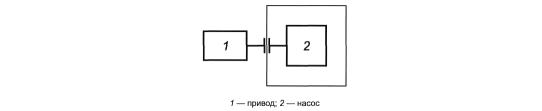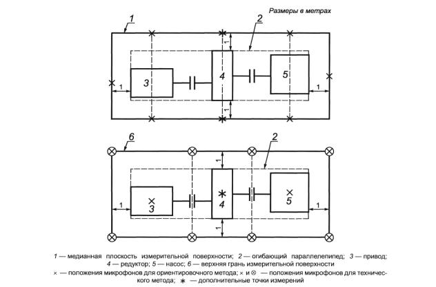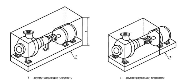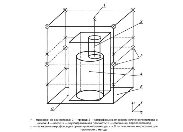 Рисунок 7 - Положение микрофона в особом случае 6 Определение уровня звука излучения6.1 Основной методУровень звука излучения определяют по ГОСТ 30720 (метод с рассчитываемым Q2) по известному корректированному по А уровню звуковой мощности. Принимают, что определенный таким образом уровень звука излучения равен среднему уровню звука излучения на поверхности, указанной в 6.2. Если значение Q2 неизвестно, то допускается применять другие подходящие методы по ГОСТ 31171. 6.2 Условное рабочее местоПоскольку насосы {насосные агрегаты) не имеют рабочего места, уровень звука излучения определяют на условном рабочем месте, в качестве которого принимают поверхность в форме параллелепипеда, отстоящую от огибающего параллелепипеда на 6.3 Неопределенность измеренийНеопределенность измерений при применении метода по ГОСТ 30720 указана в стандарте на используемый метод определения уровня звуковой мощности, при применении других методов - в соответствующем стандарте на метод измерения уровня звука излучения. 7 Условия установки и монтажа7.1 Общие положенияУсловия установки и монтажа зависят от требуемой степени точности измерений. Требования к уровню фонового шума метода на основе измерения интенсивности звука менее жесткие, чем методов на основе измерения уровней звукового давления, поскольку при измерениях интенсивности звука практически исключено влияние посторонних источников шума, таких как трубопроводы и их арматура. 7.2 Место проведения испытаний Испытания могут быть проведены:- на месте эксплуатации; - на испытательном стенде в цехе; - в специальном испытательном помещении. 7.2.1 Испытания на месте эксплуатацииДля улучшения акустических условий следует: - звукоизолировать трубопроводы на время испытаний; - проводить испытания при работе минимального числа других источников шума; - экранировать привод и трансмиссию при измерениях шума насоса; - покрывать звукопоглощающими материалами поверхности, отражающие звук. 7.2.2 Испытания на испытательном стенде в цехеШум запорно-регулирующей арматуры в линии нагнетания и в трубопроводах обвязки не должен влиять на результаты испытаний. Примечание - Предпочтительна арматура с низким уровнем шума. При испытаниях следует при необходимости: - звукоизолировать трубопроводы обвязки; - сократить до минимума число других источников шума; - экранировать привод и трансмиссию при измерениях шума насоса; - покрывать звукопоглощающими материалами поверхности, отражающие звук; - применять средства снижения вибрации. 7.2.3 Испытания в специальном испытательном помещенииПри испытаниях в специальном испытательном помещении как минимум: - используют трубопроводную арматуру с низким уровнем шума; - исключают эффект стоячей волны в подводящем и отводящем трубопроводах (например, используя заглушённые окончания на выходе перекачиваемой жидкости); - звукоизолируют подводящие и отводящие трубопроводы; - снижают вибрацию опорных поверхностей насоса или насосного агрегата; - исключают механический резонанс; - звукоизолируют привод и трансмиссию при измерениях шума насоса; - исключают наличие воздуха в перекачиваемой жидкости, например закольцовывая насос. 8 Рабочий режим при проведении измерений8.1 Общие положенияИзмерения следует проводить при работе с гидравлической жидкостью по 8.2 в рабочей точке на ха