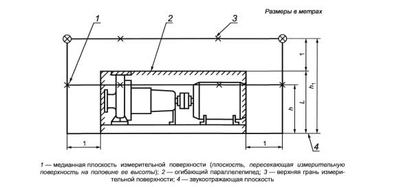 L - высота огибающего параллелепипеда, равная высоте верхней точки насосного агрегата или насоса, м; h - высота медианной плоскости измерительной поверхности h1 - высота верхней грани измерительной поверхности ( h1 = L +1 ), м. Рисунок 5 - Типовые измерительные поверхности при измерениях интенсивности звука насосного агрегата