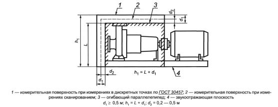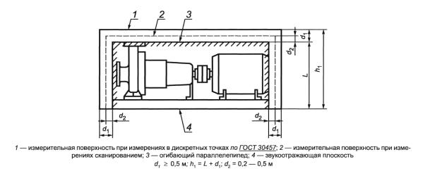 5.2.2 Измерительная поверхность и положения микрофонаИзмерительная поверхность охватывает огибающий параллелепипед на заданном измерительном расстоянии d от него. Измерительное расстояние зависит от метода измерений: - в соответствии с методами по ГОСТ 31275 и ГОСТ 31277 предпочтительно оно должно быть равно Примечание - Если требования к уровню фонового шума по этим методам не выполняются, то можно уменьшить измерительное расстояние, но оно не должно быть менее - в соответствии с методами по ГОСТ 30457 или методами 3 и 4 измерительное расстояние должно быть: d≥1 Измерительные поверхности (и точки измерений на них) показаны на рисунках 3 - 6. Требования к ним приведены в приложении А. В случае применения метода сравнения по ГОСТ 27243 точки измерений выбирают по 10.1 указанного стандарта.