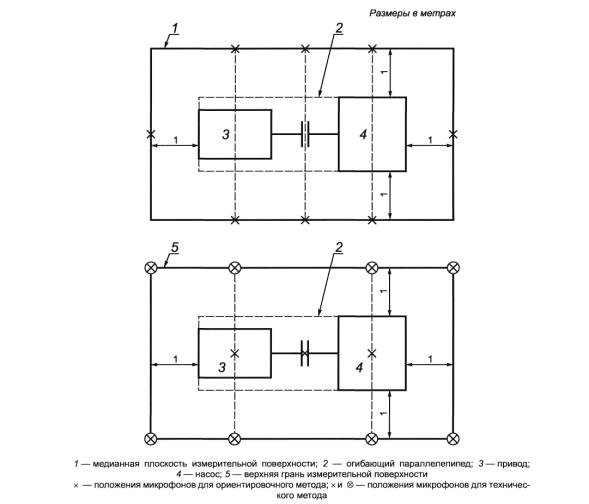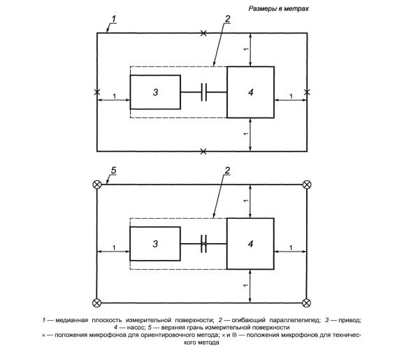 Рисунок 3 - Типовая измерительная поверхность и плоскости, в которых измеряют уровни звукового давления насосного агрегата Для насоса измерительная поверхность показана на рисунке 4. На грани поверхности, обращенной к приводу, измерения уровней звукового давления не проводят (см. также приложение А). Положения микрофонов для насосов различных типов и размеров указаны в приложении В. В случае применения метода сравнения по ГОСТ 27243 точки измерений выбирают по 10.1 указанного стандарта.