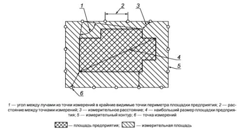 9.1 2 1 Используя чертеже планом предприятия или подходящую карту, предварительно намечают измерительный контур, соблюдая требования 9.1.1 а) и 9.1.1 b). Размещают точки измерений на этом контуре в соответствии с 9.1.1с).