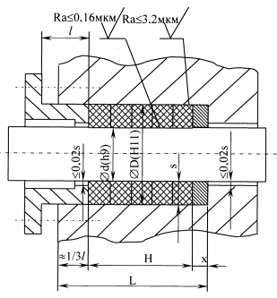 Рис. 1 1.3. Поверхности грундбуксы, подсальникового кольца, не должны иметь сколов и фасок. Острые кромки притупить, но не закруглять. 1.4. Для исключения потери герметичности сальникового уплотнения не рекомендуется применение грундбуксы и подсальникового кольца со скошенными торцами (15°). 1.5. Схема уплотнительного узла отображена на Рис. 1. 1.6. При наличии скосов, фасок и зазоров свыше требуемых рекомендуется установка крайних колец из углеродной набивки НУ - 201 (УНФ). 2. ОБЩИЕ УКАЗАНИЯ ПО УСТАНОВКЕ2.1. Перед установкой новых колец набивки необходимо удалить старые кольца набивки или их остатки. 2.2. Вал или защитную втулку необходимо проверить на износ и при слишком сильных повреждениях заменить. 2.3. При наличии в сальнике фонарного кольца, зазор между валом и отверстием фонарного кольца не должен превышать 0,02 S. 2.4. Если сальниковая камера имеет большую глубину, изготовить по месту подсальниковое кольцо. Высота подсальникового кольца x определяется как разность между глубиной сальниковой камеры L и суммой высоты сальникового пакета Н, состоящего из 4-6 колец набивки, подпрессованных на 20 % и 1/3 длины рабочей части грундбуксы l. (Рис.1). x = L - (H+1/3 l) Внутренний и наружный диаметр подсальникового кольца вычисляется по формулам; Dк = D - 0,2 (мм) dк = d + 0,2 (мм) Пример: