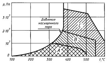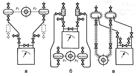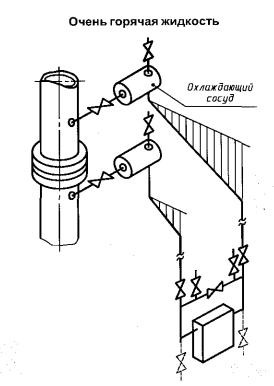 Рисунок 2 - Область применения уравнительных сосудов Вместимость сосудов должна быть тем больше, чем больше измерительный объем ППД, т.е. тот объем, который перемещается из одной камеры ППД при измерении ∆р от нуля до ∆рв. 6.2.3.2 Площадь горизонтального поперечного сечения сосуда должна быть в несколько раз больше площади вертикального сечения. 6.2.3.3 Сосуды располагают на одном уровне. При этом входные отверстия сосудов должны быть расположены не ниже отверстий для отбора давления. 6.2.3.4 Теплоизоляцию уравнительных сосудов и соединительных трубок осуществляют в случаях, показанных на схемах рисунка 3.