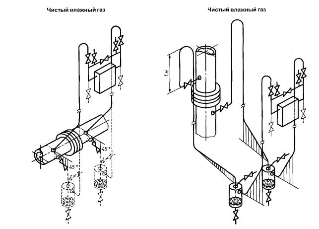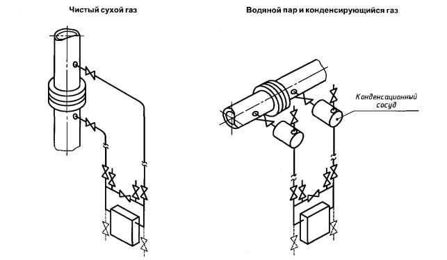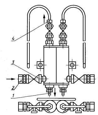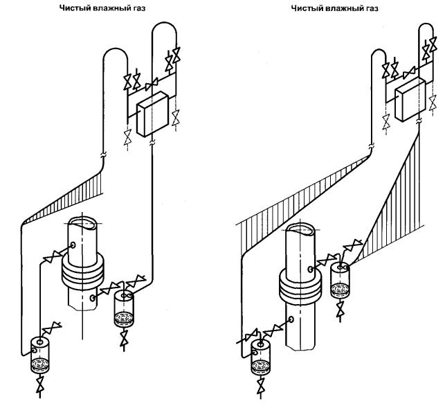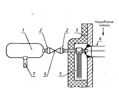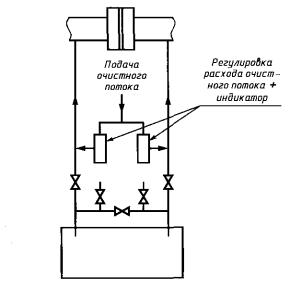 Рисунок 9 - Пример установки очистной системы 6.2.8.2 При применении очистных систем поперечное сечение по всей длине соединительных трубок должно быть постоянным. Соединительные трубки, подключенные к плюсовой и минусовой камере усреднения, должны иметь равную длину и одинаковое число сочленений. Рисунок 9 - Пример установки очистной системы 6.2.8.3 Для поддержания равных расходов-очистного потока в обеих соединительных трубках в очистной системе устанавливают расходомеры (например, ротаметры) между продувочным краном и точкой ввода очистного потока в соединительную трубку. 6.2.8.4 Необходимо следить за тем, чтобы очистка не влияла на показания ППД и на температурное равновесие между двумя соединительными трубками. 6.2.8.5 Используемый в качестве очистительного вещества газ вводят в соединительные трубки под большим давлением по сравнению с давлением среды. Очистной поток регулируют игольчатым вентилем. 6.2.8.6 При недостаточной эффективности описанных выше методов очистки для предохранения отверстий для отбора давления от загрязнения используют зонды (рисунок 10) или применяют другие методы очистки.