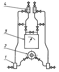 1 - отстойная камера; 2 - СУ; 3 - ППД; 4 - воздухосборник Рисунок 5 - Схема соединений отстойной камеры для измерений расхода воды при установке ППД выше СУ
