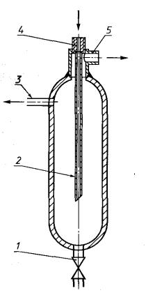 1 - продувочный кран; 2 - игольчатая трубка; 3 - выходной патрубок; 4 - входной патрубок; 5 - вентиляционный патрубок Рисунок 6 -- Отстойная камера 6.2.4.2 Отстойные камеры размещают в нижней точке соединительных трубок. Схема соединений отстойной камеры приведена на рисунке 5. 6.2.4.3 На рисунке 6 приведена типовая модель-отстойной камеры. Вверху резервуара должно быть свободное пространство, обеспечивающее доступ к продувочному крану. Кран должен быть шаровым, чтобы его можно было промывать и очищать при засорении или образовании накипи. 6.2.4.4 Размеры отстойной камеры обусловлены-необходимостью чистки и технического ухода, а также количеством твердых частиц в протекающем потоке и(или) степенью конденсации. 6.2.5 Газосборные камеры 6.2.5.1 При измерениях расхода жидкости, содержащей газ, возможно скопление газа в соединительных трубках. Для устранения скопления газа ППД устанавливают ниже СУ, а соединительные трубки располагают под постоянным уклоном вниз от СУ до ППД. При необходимости установки ППД выше СУ устанавливают газосборные камеры. 6.2.5.2 Газосборные камеры устанавливают выше ППД. 6.2.5.3 Рекомендуемая форма газосборной камеры приведена на рисунке 7. 6.2.6 Способы защиты соединительных трубок при низкой температуре окружающей среды 6.2.6.1 Для предохранения отзамерзанияжидкости в соединительных трубках при низкой температуре окружающей среды применяют обогреватели (электронагреватели, паровые змеевики и др.).