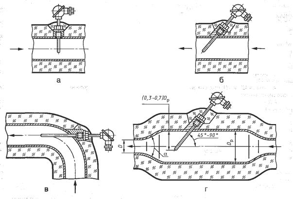 6.3.8 Если среда - газ, то при наличии больших потерь давления (∆ω > 1,6 105 Па) на СУ необходимо рассчитывать температуру до СУ по измеренной температуре после СУ по формуле T = T2 + μJT ∆ω, где Т2 - измеренное значение температуры после СУ, К. Потерю давления ∆ω в СУ следует определять согласно ГОСТ 8.586.2 (подраздел 5.4), ГОСТ 8.586.3 (пункты 5.1.8, 5.2.8 и 5.3.6), ГОСТ 8.586.4 (подраздел 5.9) в зависимости от типа СУ. Коэффициент Джоуля - Томсона μJT определяют в соответствии с ГОСТ 8.586.1 (пункт 3.3.8). 6.3.9 При установке ПТ в гильзу (карман) обеспечивают надежный тепловой контакт, заполняя гильзу, например, жидким маслом. ПТ погружают в гильзу на полную ее глубину (с монтажным зазором). Рекомендуется, чтобы зазор между боковыми стенками гильзы и ПТ не превышал 0,5мм. Часть ПТ, выступающая над ИТ, должна иметь термоизоляцию, если температура потока отличается от температуры окружающей среды более чем на 40°С. Рекомендуется ПТ или его защитную гильзу (при ее наличии) термоизолировать от стенки ИТ. Примечание - При установке ПТ дополнительно рекомендуется учитывать требования, изложенные в [2]. 6.4 Средства измерений плотности, состава и влажности среды6.4.1 Определение плотности среды при рабочих условиях 6.4.1.1 Плотность среды в рабочих условиях допускается определять прямым методом измерений с применением плотномеров любого типа, не изменяющих структуру потока, или косвенными методами измерений. 6.4.1.2 Точку отбора пробы газа располагают в верхней, а жидкостей - в нижней части горизонтального участка трубопровода. Точки отбора пробы располагают на участке трубопровода, где скорость потока более нуля и отсутствуют завихрения. 6.4.1.3 Если плотномер находится во внутренней полости трубы, то расстояние между ним и СУ должно составлять: - не менее указанного для ПТ в 6.3.5 (при соответствии диаметра погружаемой в полость трубопровода части плотномера диапазону значений диаметра ПТ) - при его установке до СУ; - не менее 8D - при его установке после СУ. 6.4.1.4 Изменение плотности среды отслеживают, создавая поток через чувствительный элемент плотномера путем ответвления части общего потока. Схемы установки плотномеров приведены на рисунке 12.