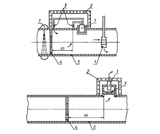 1 - плотномер; 2 - теплоизоляция; 3 - вентиль; 4 - сужающее устройство; 5 - трубопровод Рисунок 12 - Схемы установки плотномеров 6.4.1.5 Для очистки пробы от примесей на входе плотномеров допускается применение фильтров и осушителей. Однако эти устройства не должны изменять состав среды. 6.4.1.6 Равенство температуры измеряемой среды и пробы среды, находящейся в чувствительном элементе плотномера, обеспечивают, размещая последний в потоке измеряемой среды и теплоизолируя от внешней среды все его элементы, в которых находится проба и которые соприкасаются с внешней средой до попадания этой пробы в чувствительный элемент плотномера. 6.4.1.7 В общем случае значения давления и температуры, а следовательно, и плотности в чувствительном элементе плотномера могут отличаться от значений данных параметров в месте отбора-давления перед СУ. Если невозможно обеспечить равенство температуры и давления среды и ее пробы, находящейся в чувствительном элементе плотномера, то вводят поправки к показаниям плотномера. При этом значение плотности среды рассчитывают по формулам: - для газа