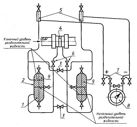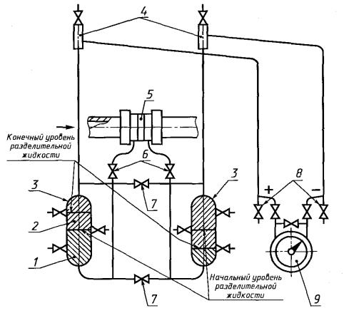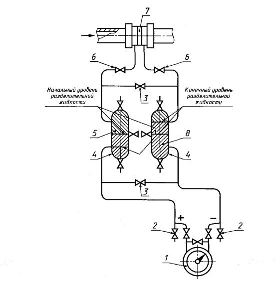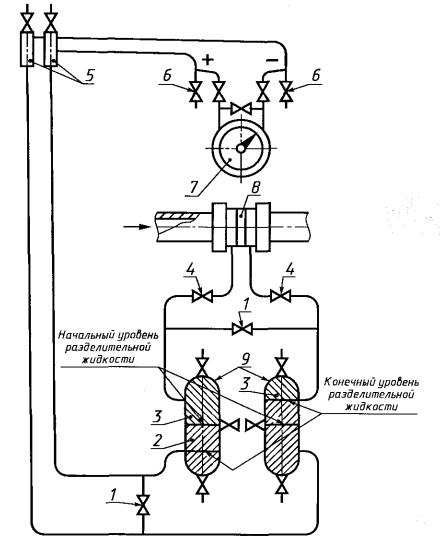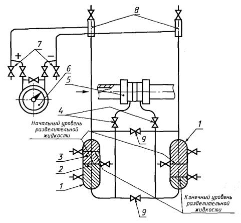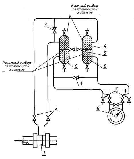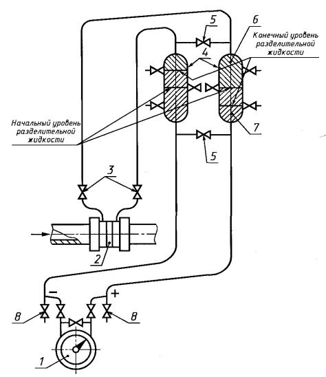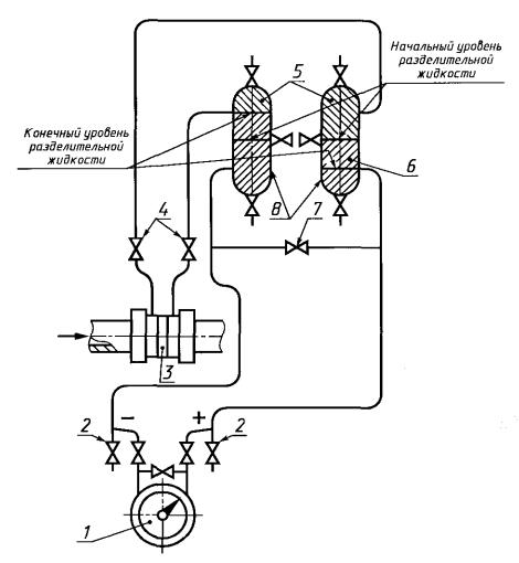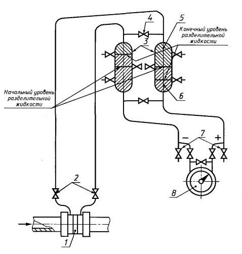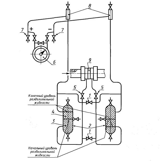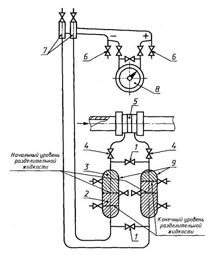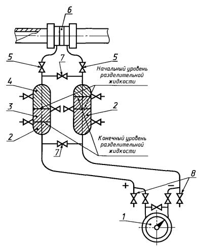 7 - выходной патрубок; 2 - входной патрубок; 3 - кран; 4 - вентиляционный патрубок Рисунок 7 - Газосборные камеры Способы защиты от действия низких температур выбирают в зависимости от конкретных условий. 6.2.6.2 Нагревание должно быть равномерным для всех соединительных трубок и их вспомогательных узлов. Соединительные трубки располагают рядом и теплоизолируют. 6.2.6.3 Минимальная температура нагрева соединительных трубок должна быть выше температуры замерзания жидкости (для жидких сред) или выше температуры образования конденсата (для газообразных сред). Максимальная температура нагрева соединительных трубок не должна превышать температуру кипения измеряемой жидкой среды и допускаемую температуру среды для применяемого ППД. 6.2.6.4 Рекомендуется применять обогрев холодных соединительных трубок малого диаметра во избежание их засорения при измерениях расхода вязких-горячих жидкостей. 6.2.7 Разделительные сосуды 6.2.7.1 Если среда вызывает коррозию, обладает способностью к конденсации или замерзанию в соединительных трубках, имеет очень высокую вязкость или может образовывать накипь, то применяют разделительные сосуды, заполненные жидкостью, отделяющей среду от ППД или от уравновешивающей жидкости, применяемой в ППД. Однако следует иметь в виду, что разделительная жидкость не будет защищать соединительные трубки между отверстиями для отбора давления и разделительными сосудами. 6.2.7.2 Разделительные сосуды применяют с перегородками или без них. В разделительных сосудах без перегородок разделительная жидкость не должна смешиваться или вступать в химическую реакцию с измеряемой средой или уравновешивающей жидкостью и ее плотность должна существенно отличаться от плотности этих двух веществ для обеспечения постоянства поверхности контакта. 6.2.7.3 При отсутствии перепада давления поверхность раздела измеряемой среды и разделительной жидкости должна находиться на одном и том же уровне в обоих сосудах. 6.2.7.4 Применение разделительных сосудов влияет на показания ППД таким образом, что перепад давления на СУ становится больше разности давления в ППД. Влиянием разделительных сосудов на показания ППД можно пренебречь при условии удовлетворения неравенству