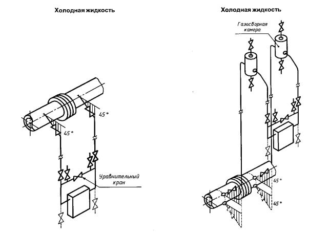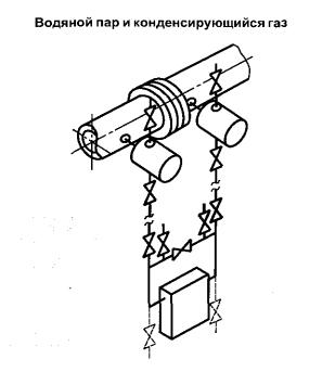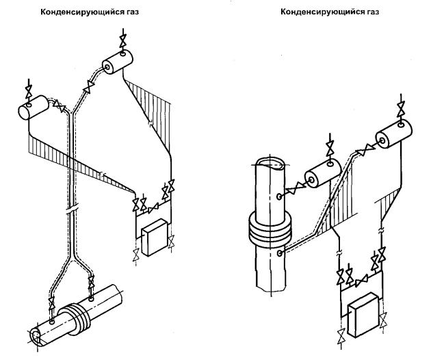 Рисунок 3 - Схемы расположения уравнительных сосудов и соединительных трубок 6.2.3.5 ППД при измерении расхода пара рекомендуется располагать ниже СУ (см. рисунок 3а). При р > 0,2 МПа допускают устанавливать ППД выше СУ по схеме, представленной на рисунке 3б (данная схема применима также при расположении ППД ниже СУ на расстоянии 1,5 м). При установке ППД по рисунку 3б следует в наивысших точках соединительныхтрубокустанавливать газосборники. Схема расположения уравнительных сосудов и соединительных трубок (см. рисунок 3в) допустима при р ≤ 0,2 МПа и расстоянии между сосудом и трубопроводом не более 4 м. При этом трубки, соединяющие СУ с сосудами, должны иметь внутренний диаметр 25 мм. 6.2.3.6 При работе с паром высокого давления и высокой температуры применяют обогревающие цилиндры с ловушками, объем которых должен быть равен объему уравнительных сосудов. Схема расположения обогревающих цилиндров и ловушек на ИТ приведена на рисунке 4. 6.2.4 Отстойные камеры 6.2.4.1 При измерениях расхода жидкости, пара и газа, в которых имеется взвесь или влага (в газах), применяют отстойные камеры.