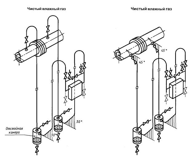 6.2.9.4 Соединительные трубки устанавливают с уклоном к горизонтали более чем 1:12. Такой уклон обеспечивает движение конденсата и твердых частиц вниз до обогревающих отстойников или цилиндров, а пузырьков газа вверх - до газосборных камер. Допускается делать уклоны ступенчатыми при условии, что отстойные камеры находятся во всех нижних точках, а газосборные камеры - во всех верхних точках. 6.2.9.5 Разностьдлины соединительных трубок ППД должна быть как можно меньшей. 6.2.9.6 При подключении к СУ двух или более ППД допускается подключение соединительных трубок одного ППД к соединительным трубкам другого. При этом расстояние от СУ до мест подключения соединительных трубок подключаемого ППД должно быть одинаковым, насколько это возможно. 6.2.10 Запорная арматура измерительного преобразователя перепада давления или дифманометра 6.2.10.1 ППД оснащают присоединительными (разъединительными), продувочными и уравнительными кранами (вентилями). Эти устройства (полностью или часть из них) могут быть конструктивно-выполнены в одном блоке. 6.2.10.2 Присоединительные краны (вентили) предназначены для подключения (отключения) ППД к соединительным трубкам. При работе ППД в режиме измерений присоединительные краны (вентили) должны быть полностью открыты. 6.2.10.3 Продувочные краны (вентили) предназначены для очистки соединительных трубок. При работе ППД в режиме измерений продувочные краны (вентили) должны быть закрыты. Для чистых сред функции продувочных кранов (вентилей) могут выполнять средства вентиляции камер ППД. 6.2.10.4 Уравнительный кран (вентиль) предназначен для создания нулевого значения перепада давления на ППД. Во время этой операции присоединительные и продувочные краны (вентили) должны быть закрыты. При работе ППД в режиме измерений уравнительный кран (вентиль) должен быть закрыт. При продувке соединительных трубок и камер ППД уравнительный кран (вентиль) должен быть открыт. 6.2.10.5 В приложении Г приведены различные схемы присоединения ППД при измерениях расхода и количества различных сред. 6.2.11 Измерение давления среды 6.2.11.1 Давление среды - это сумма избыточного и атмосферного давлений p = pи + pa (6.2) 6.2.11.2 СИ абсолютного или избыточного давления подключают к отдельному отверстию перед СУ, размещенному в сечении ИТ в месте установки отверстия для отбора перепада давления. Допускается присоединение ПД к «плюсовой» соединительной трубке ППД. 6.2.11.3 Измерения абсолютного или избыточного давления конденсирующего газа и пара в случае применения конденсационных сосудов выполняют с учетом разности высот установки СУ и ПД. В этом случае давление рассчитывают по формуле p = pп - ρк gh, где рп - показание ПД абсолютного давления или сумма показаний ПД избыточного и атмосферного давления, Па; рк - плотность конденсата в соединительной трубке, кг/м3; g - ускорение свободного падения, м/с2; h - разность высот установки конденсационного сосуда и ПД, м. 6.2.11.4 Атмосферное давление измеряют в месте расположения ПД избыточного давления, если последний размещен в замкнутом пространстве при наличии поддува, создаваемого системами кондиционирования. 6.2.11.5 Атмосферное и (или) избыточное давление могут быть приняты за условно-постоянную величину. При этом учитывают соответствующую составляющую неопределенности результата измерения давления в соответствии с 10.4.4. 6.3 Сре