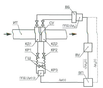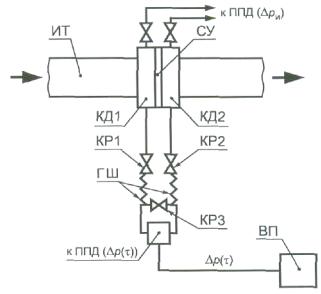 КД1,2 - камеры отбора давления; КР1,2 - разделительные краны; КР3 - уравнительный кран; ГШ - бронированные шланги; ППД (∆р(τ)) - СИ перепада давления, применяемое для испытаний; ППД (∆ри) - СИ перепада давления, входящее в комплект технических средств, применяемых для определения расхода и количества среды