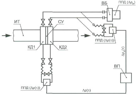 КД1.2 - камеры отбора давления; ППД (∆р(τ)) - СИ перепада давления, применяемое для испытаний; ППД(∆ри) - СИ перепада давления, входящее в комплект технических средств, применяемых для определения расхода и количества среды