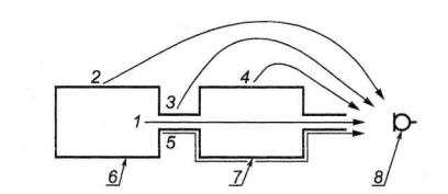 Где D1/3,k (k=1,2,3) - ослабление в 1/3-октавных полосах, относящееся кодной октавной полосе, дБ, и D1/1 - результирующее ослабление в данной октавной полосе. Заявляемое ослабление в целой октавной полосе будет применимо для широкополосного шума и для широкополосных глушителей. Для тонального шума и для резонаторных глушителей, эффективных в узкой полосе частот, ослабление должно быть задано в 1/3-октавных полосах. Примечание - Ослабление в октавных полосах может сильно зависеть от спектра шума (см. приложение В). Необходимым параметром для выбора глушителя являются допустимые потери давления в потоке. Они не должны превысить потери полного давления Δрt, которые зависят от средней скорости потока и плотности газа, а также условий распространения потока, описываемых уравнением где ζ- коэффициент потерь полного давления, определенных по [1] для условий однородного потока на обоих концах глушителя; Δζ -коэффициент дополнительных потерь давления, обусловленный отличием условий переноса потока на месте эксплуатации глушителя от условий при лабораторных испытаниях (эта величина подлежит экспериментальной оценке); р - плотность газа, кг/м3; v1 - средняя скорость потока во входном сечении, м/с. Примечание - Определения коэффициента потерь полного давления отличаются от определений, устанавливаемых [1]. Поэтому необходимо проверять соответствие определений перед использованием всех величин. Например, имеется другое определение скорости потока v\ как скорости в самом узком поперечном сечении глушителя. Это приводит к существенно более низким значениям ζ Другими требующими рассмотрения параметрами, влияющими на акустические и аэродинамические характеристики, являются: - потоковый шум; - максимальные размеры, допустимые для глушителя; - необходимая долговечность глушителя, подвергающегося воздействию потока, пульсаций давления и механической вибрации. 5.3 Пути распространения звукаПомимо прямого распространения звука через глушитель до точки приема 8 (рисунок 1, путь 1) возможно распространение звука многими другими путями. Дополнительные пути излучения: a) от корпуса источника б (путь 2); b) от стенок канала, расположенных до глушителя (путь 3); c) от корпуса 7 самого глушителя (путь 4) и d) структурно распространяющегося звука по глушителю и за ним (путь 5). Распространение звука вдоль указанных боковых путей должно быть исключено обеспечением корпусов источников и стенок канала соответствующей звукоизоляцией и установкой виброизоляторов для устранения распространения структурного шума.
