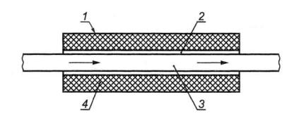 1 - оболочка; 2 - звукопроницаемое покрытие; 3 - труба для прохождения потока; 4 - звукопоглощающий материал Рисунок 2 - Диссипативный глушитель (схематично) Звукопоглощающий элемент состоит из одного или нескольких слоев поглощающего материала и звукопроницаемого покрытия. В качестве поглощающего материала используют тонкие минеральные, металлические или пластмассовые волокна и структуры с открытыми порами, изготовленные из пенопласта, металлокерамики или бетона. В крупнозернистых структурах скорость воздуха имеет меньшее влияние по сравнению с турбулентностью. В этом случае разность давлений будет увеличиваться как квадрат скорости потока. Такие нелинейные эффекты могут иметь место в глушителях, где поток проходит через поглотитель или вдоль него. Для защиты волокнистых и пористых материалов, испытывающих большие нагрузки, применяют перфорированные металлические листы с ромбовидной или ребристой ячейкой в сочетании с плотно сплетенным проволочным экраном, стеклотканью или полотном из стального волокна. Для ослабления жестких условий эксплуатации могут быть использованы тонкая фольга, стекловолокно или синтетическая вата. Потери при прохождении Dt (или вносимые потери Di см. 3.11) в простом диссипативном глушителе могут быть выражены формулой