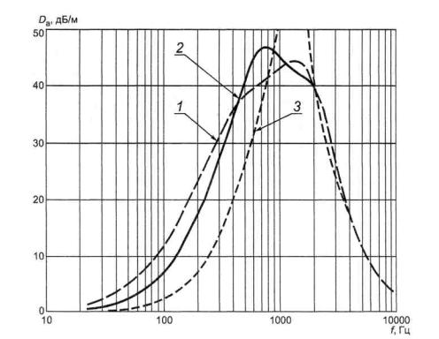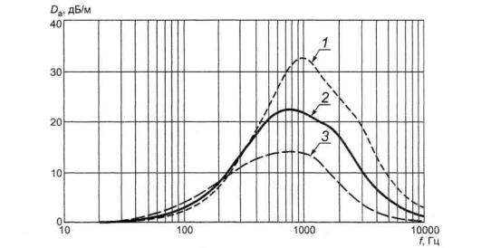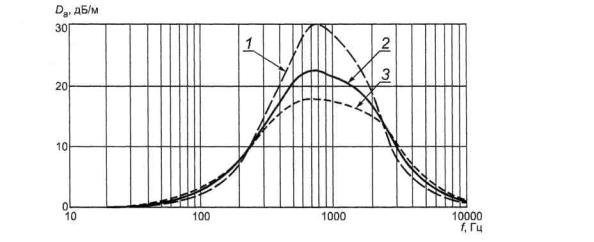 Толщина звукопоглощающих пластин d:1 - 0,15 м; 2 - 0,2 м; 3 - 0,3 м. Удельное сопротивление продуванию изотропного поглотителя r =12 кН с/м4. Сопротивление продуванию слоя покрытия Rs - 0,2 кН с/м3. Рисунок 7 - Зависимость удельных потерь распространения Da от частоты f для глушителя с пластинами разной толщины и шириной воздуховодов между пластинами, равной толщине пластин